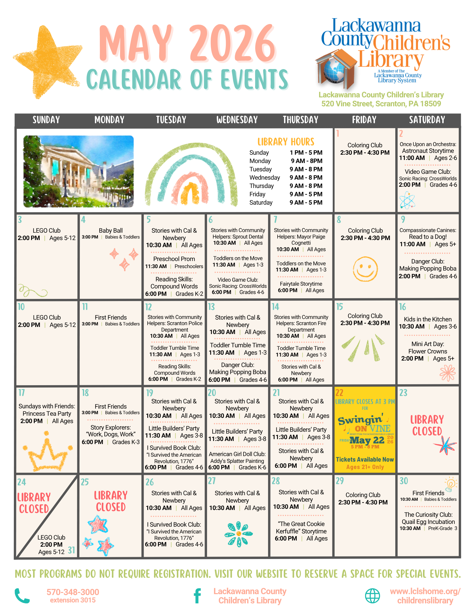 Join us each week for a space and bonding opportunity for families with babies and toddlers to support each other. Each week, the library will provide different programs, including age-appropriate […] Join us for a story time featuring stories, songs, finger plays, a craft, and a puppet show with one of the Library's mascots, Cal or Newbery! For families with children […] Calling all soccer enthusiasts! When a contest offering a once-in-a-lifetime chance to attend the World Cup is announced, Ethan, Sasha, and Mateo are determined to win. A scavenger hunt for […] Join us for a story time featuring stories, songs, finger plays, a craft, and a puppet show with one of the Library's mascots, Cal or Newbery! For families with children […] Join us for a story time featuring stories, songs, finger plays, a craft, and a puppet show with one of the Library's mascots, Cal or Newbery! For families with children […] Join us for a story time featuring stories, songs, finger plays, a craft, and a puppet show with one of the Library's mascots, Cal or Newbery! For families with children […] Come color your world and hang out at the Library! On Fridays we will have a variety of different coloring supplies available, and a variety of coloring pages suitable for […] Team up with friends to take down enemy inklings and claim victory in this classic Nintendo Switch game! For kids in grades 4 through 6. Lackawanna County Children's Library 520 […] The Albright Memorial Library & Lackawanna County Children's Library will be closed on Sunday, April 5, 2026 in observance of Easter Sunday. Join us each week for a space and bonding opportunity for families with babies and toddlers to support each other. Each week, the library will provide different programs, including age-appropriate […] Join us for a story time featuring stories, songs, finger plays, a craft, and a puppet show with one of the Library's mascots, Cal or Newbery! For families with children […] Toddlers will enjoy creating sound and music while moving and dancing to their favorite songs, rhymes, and finger plays. For children ages 1 through 3. Lackawanna County Children's Library 520 […] Special guest, Michele Dembesky from the Daughters of the American Revolution, will join us in costume to help bring the past to life as we celebrate America250 and Pennsylvania! For […] Toddlers will enjoy creating sound and music while moving and dancing to their favorite songs, rhymes, and finger plays. For children ages 1 through 3. Lackawanna County Children's Library 520 […] Team up with friends to take down enemy inklings and claim victory in this classic Nintendo Switch game! For kids in grades 4 through 6. Lackawanna County Children's Library 520 […] Join us for a story time featuring stories, songs, finger plays, a craft, and a puppet show with one of the Library's mascots, Cal or Newbery! For families with children […] Toddlers will enjoy creating sound and music while moving and dancing to their favorite songs, rhymes, and finger plays. For children ages 1 through 3. Lackawanna County Children's Library 520 […] Dress up as your favorite superhero and join us for this SUPER fun storytime! We will read stories about superheroes, share special snacks, and even design our own capes to […] Come color your world and hang out at the Library! On Fridays we will have a variety of different coloring supplies available, and a variety of coloring pages suitable for […] Did you know you could make your slime magnetic? Find out how at this month’s Danger Club! For children in grades 4 through 6. Lackawanna County Children's Library 520 Vine […] Join us as we welcome juggler extraordinaire, Rob Smith, to the Library! Prepare to be mesmerized by this performance. Rob will be juggling balls, clubs, fire torches, rings, and flying […] Join us each week for a space and bonding opportunity for families with babies and toddlers to support each other. Each week, the library will provide different programs, including age-appropriate […] Join Miss Jenna to explore "The Dog and Pony Show: Dance Pants" by Jeff Mack! We will read the book together, discuss its literary elements, and have our own dance […] Join us for a special storytime to celebrate Financial Literacy Month with Cal and our friends from Penn East Federal Credit Union! They will read stories, sing songs, and of […] Join us as we work on skills such as balancing, throwing, kicking, and jumping. We will be using a combination of movement and one-on-one activities for parents and children. For […] This month we will practice remembering what we have read. We will read together and retell the story in our own words. We will also continue to practice our sight […] Join us for a special storytime to celebrate Financial Literacy Month with Cal and our friends from Penn East Federal Credit Union! They will read stories, sing songs, and of […] Join us as we work on skills such as balancing, throwing, kicking, and jumping. We will be using a combination of movement and one-on-one activities for parents and children. For […] Did you know you could make your slime magnetic? Find out how at this month’s Danger Club! For children in grades 4 through 6. Lackawanna County Children's Library 520 Vine […] Join us for a special storytime to celebrate Financial Literacy Month with Cal and our friends from Penn East Federal Credit Union! They will read stories, sing songs, and of […] Join us as we work on skills such as balancing, throwing, kicking, and jumping. We will be using a combination of movement and one-on-one activities for parents and children. For […] Join us for a special storytime to celebrate National Architecture Week with Cal and our friends from the PA American Institute of Architects. They will read stories, discuss their jobs, […] Join us at the library for a special weekend celebration of creativity and community! The Scranton Public is proud to host a