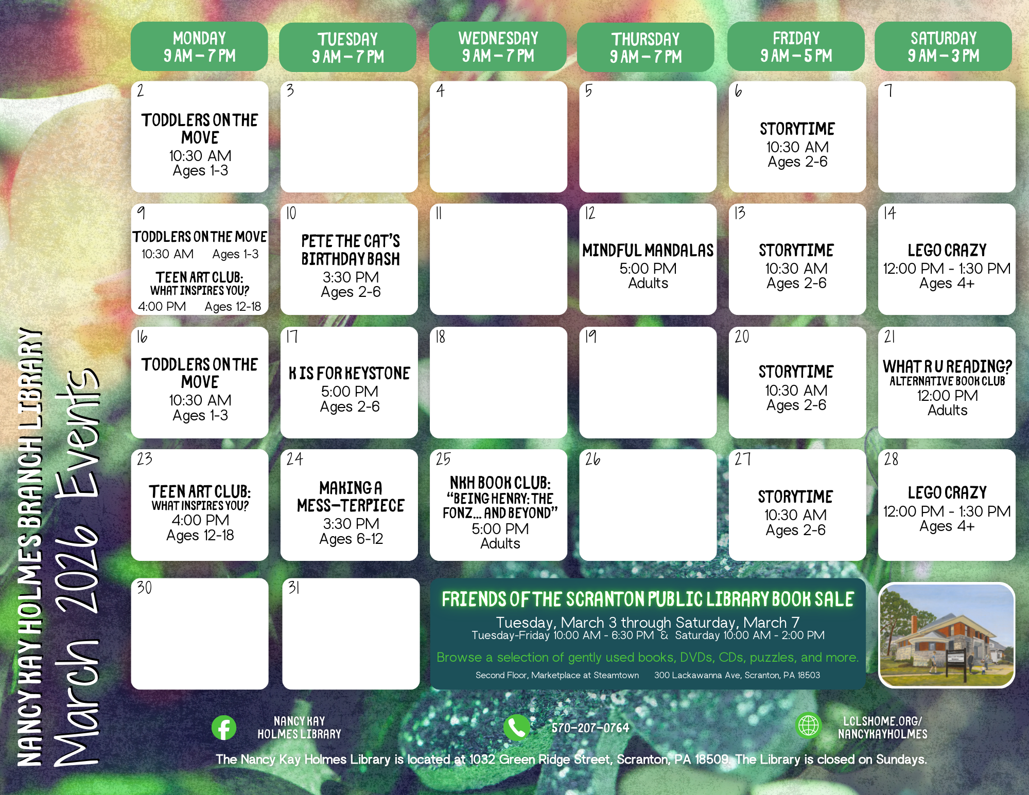 Come share your inspirations and practice your favorite crafts with the NKH Teen Art Club! Whether you'd like to sketch, sculpt clay, or string up some kandi creations, the library […] The Library has lots of LEGOs, so stop by and enjoy some time to be creative and build whatever comes to mind! For kids ages 4 and older. No registration […] We invite anyone interested in tapping into their creative side through drawing to join us! Learn how to draw with expert artist, Ky Betts, in this drawing class for beginners. […] Join us as we work on skills such as balancing, throwing, kicking, and jumping using a combination of music, movement, and one-on-one activities for parents and children. For children ages […] Come celebrate Valentine's Day early! Local romance novelists Cissy Mecca and Tina Gallagher will be on hand to discuss the popularity of the romance genre and how they hone their […] Little one loves to move and groove? Children are invited to sing, dance, and explore music together in a lively and interactive setting. Through activities such as stories, singing, dancing, […] The Albright Memorial Library, Lackawanna County Children's Library, Lackawanna County Library System Bookmobile, and Nancy Kay Holmes Branch will be closed on Monday, February 16, 2026 in observance of President's […] The Library has lots of LEGOs, so stop by and enjoy some time to be creative and build whatever comes to mind! For kids ages 4 and older. No registration […] We invite anyone interested in tapping into their creative side through drawing to join us! Learn how to draw with expert artist, Ky Betts, in this drawing class for beginners. […] Looking to talk about books but don’t want to be confined to discussing one specific title? Join our alternative book club where everyone talks about their favorite book or a […] Come share your inspirations and practice your favorite crafts with the NKH Teen Art Club! Whether you'd like to sketch, sculpt clay, or string up some kandi creations, the library […] Are we making a mess or making a masterpiece? Both! Join Miss Maggie as we explore unique (and messy!) ways to make art. For kids ages 6 through 12 Nancy […] Join us at the Library to discuss an exciting new title each month. September's pick is Remarkably Bright Creatures by Shelby Van Pelt. Stop by the Library to borrow a […] Come have a blast testing your patriotic knowledge while we celebrate the 250th Anniversary of the United States! We will provide delicious snacks for all trivia participants to sample. Intended […]Events